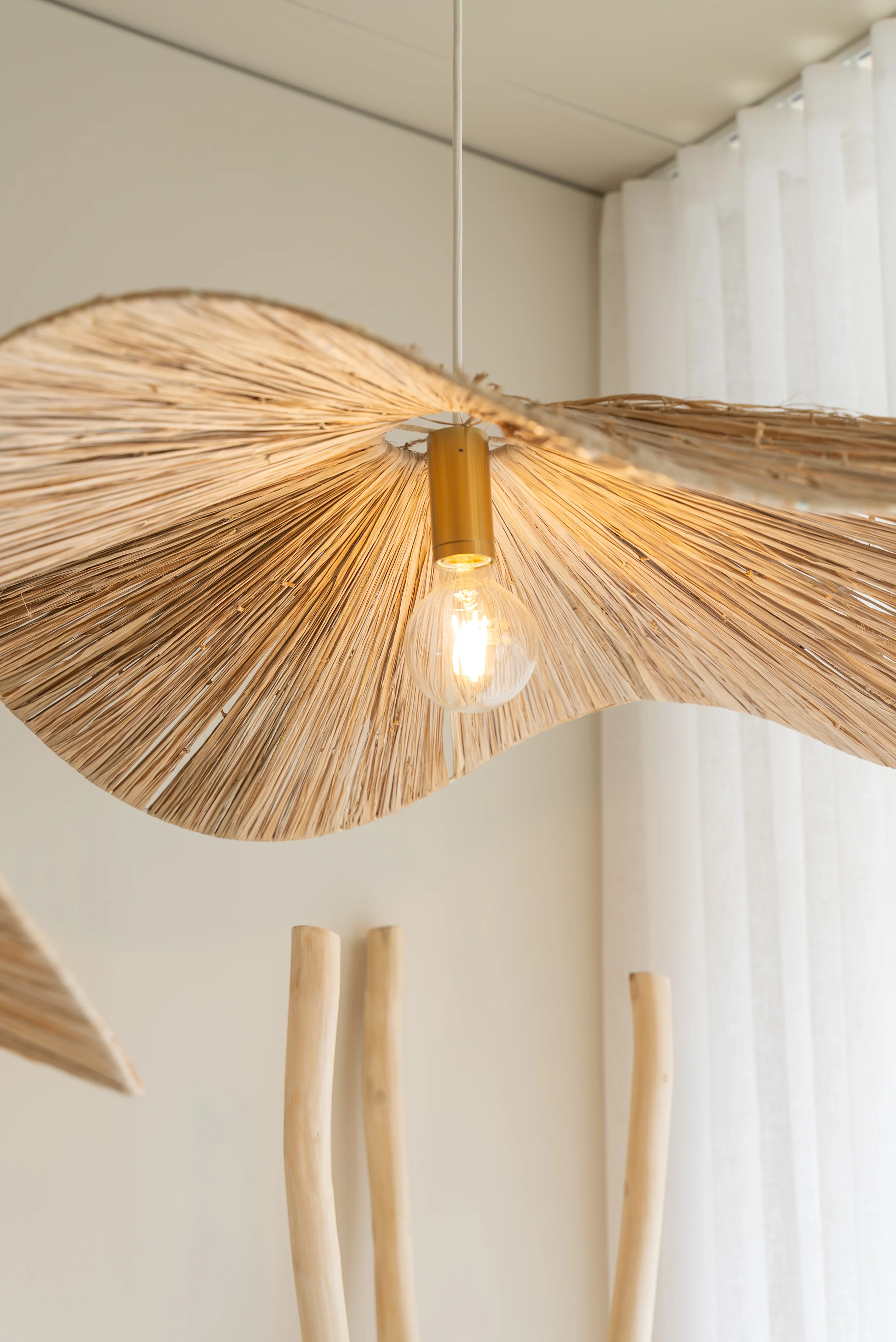 Handmade by our skilled artisans using natural raffia, this pendantâs distinctive wave-like silhouette creates beautiful organic shadows when lit, adding warmth and texture to any setting. Its relaxed yet refined design works seamlessly above a kitchen bench, over an indoor or outdoor dining table, or as a statement feature in your living space.